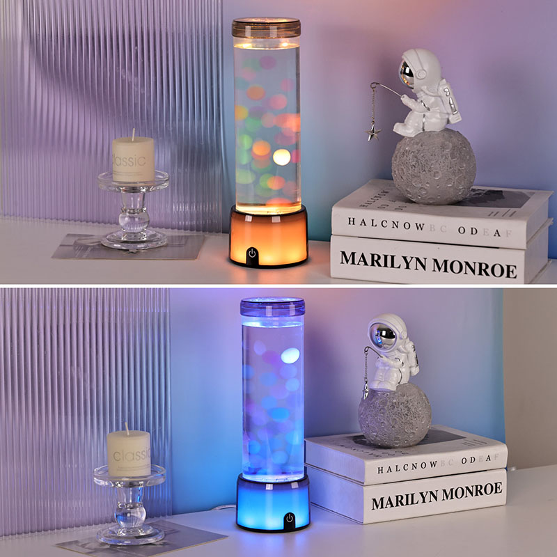 램프의 높고 우아한 원통 모양은 다양한 인테리어 스타일을 보완하는 현대적이고 미니멀한 느낌을 줍니다. 투명한 본체 덕분에 떠다니는 해파리와 반짝이는 빛 반사를 포함한 내부 요소를 완벽하게 볼 수 있습니다. 내부의 액체는 물의 흐름을 시뮬레이션하도록 특별히 제작되어 부동 동작의 현실감을 향상시킵니다. LED의 색상이 바뀌면서 해파리는 생기가 넘치는 것처럼 보이며 장면에 깊이와 움직임을 더해줍니다.