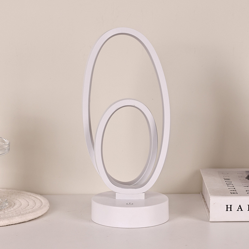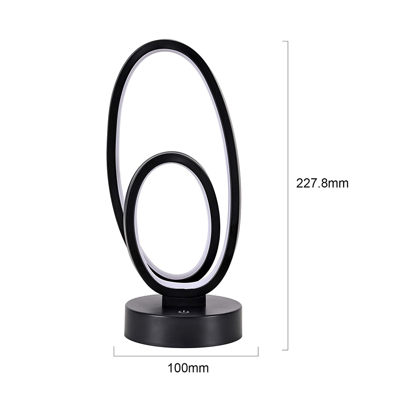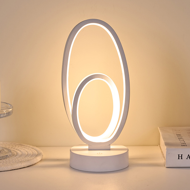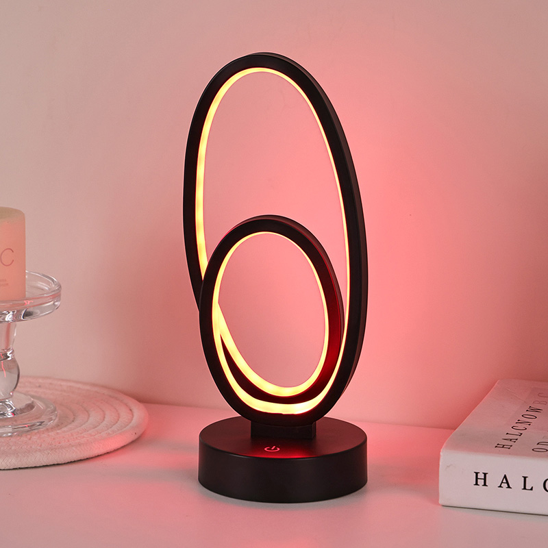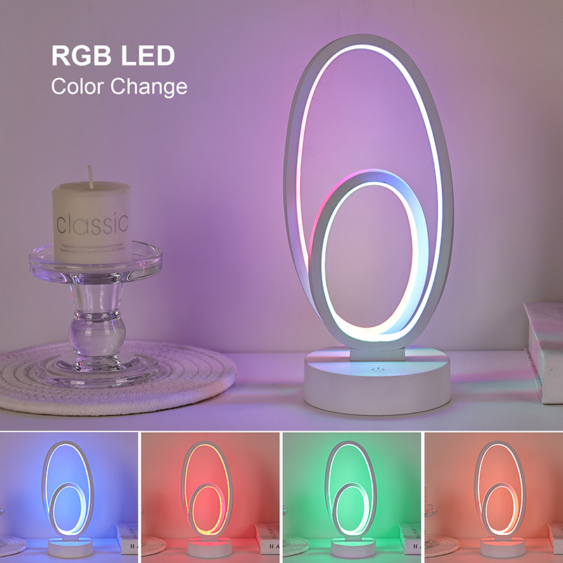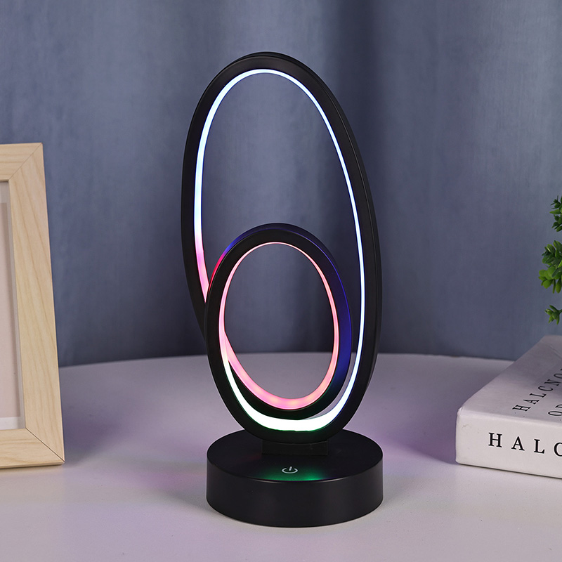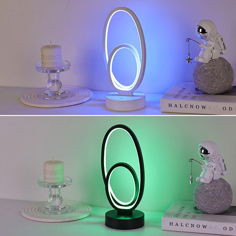 44*33*H23.5cmDouble Circular Ring Shade RGB Desk Lamp는 미니멀리스트 라인으로 윤곽이 그려진 우아한 윤곽이 있는 이중 링 디자인을 특징으로 합니다. 메탈과 고급 플라스틱을 결합하여 뛰어난 질감과 섬세한 터치를 자랑합니다. 조명 도구를 넘어
