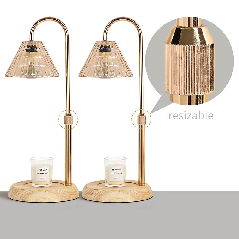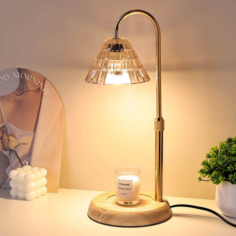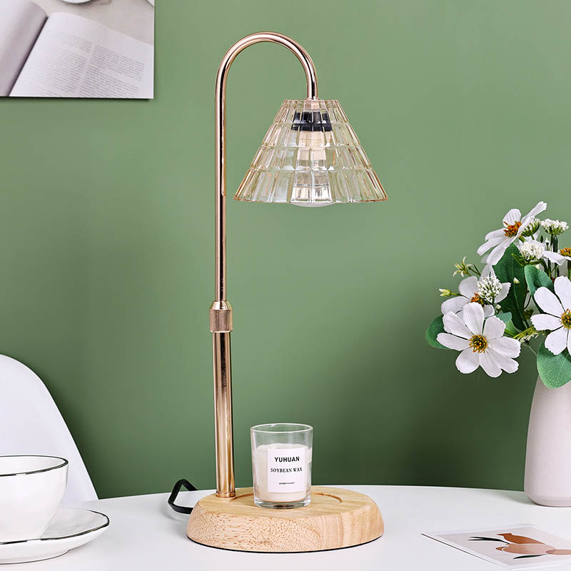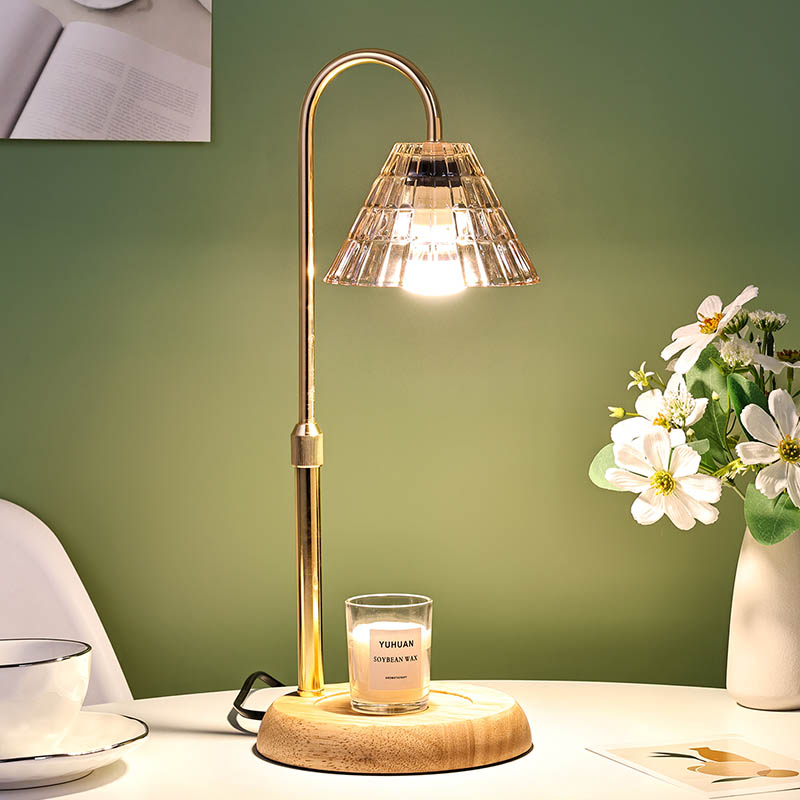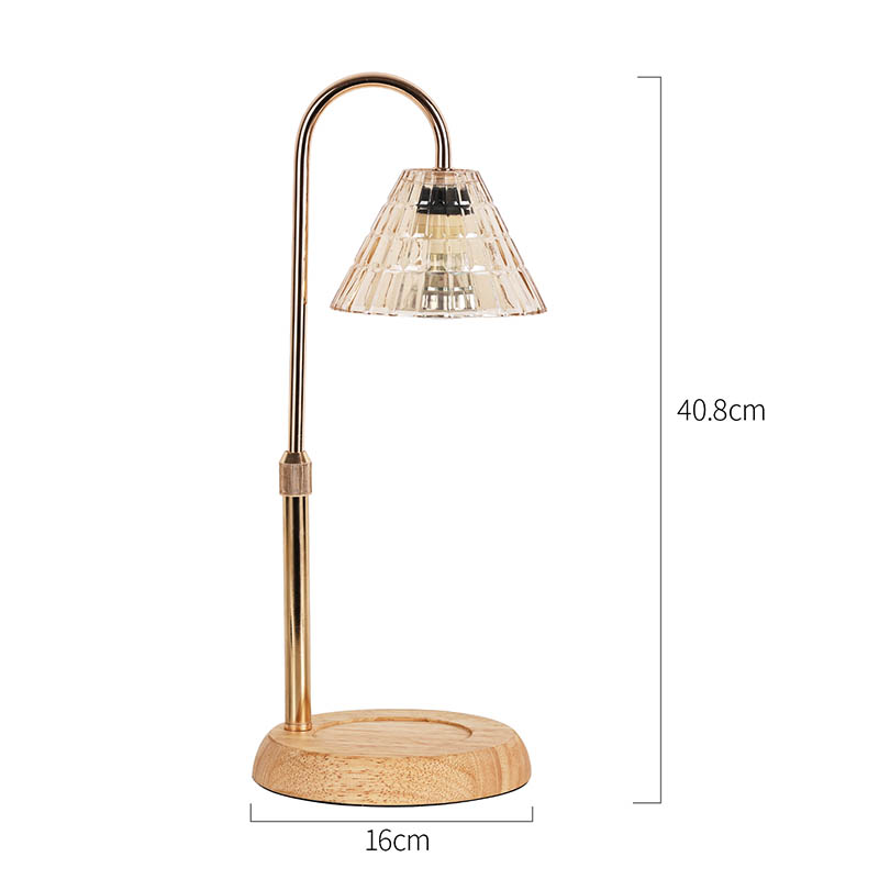 높이 조절이 가능한 유리 전등갓 테이블 램프는 전통적인 디자인 스타일로, 나무 베이스가 있는 전통적인 전구와 황금색 금속 램프 기둥으로 구성되어 있습니다.