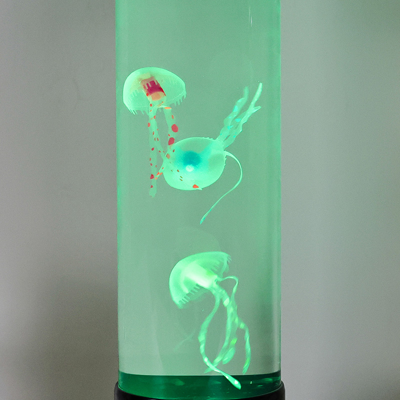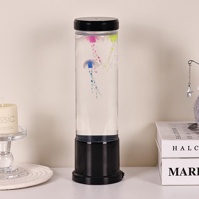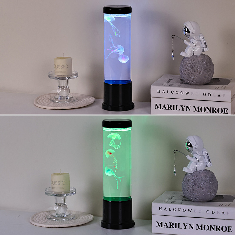 자연에서 영감을 받은 우아한 디자인이 만나다 Hight 크기의 LED 해파리 램프는 내부의 우아한 해파리를 선명하게 볼 수 있는 고품질 투명 아크릴로 제작된 크고 가느다란 원통을 특징으로 합니다. 부드러운 파란색 액체 매체에 담겨 있는 실물과 같은 해파리 세 마리가 부드럽게 떠다니며 고동치고, 이들의 반투명 몸체는 역동적이고 다양한 색상의 LED 조명으로 비춰집니다. 부드러운 빛은 깊은 바다의 파란색과 보라색부터 부드러운 분홍색과 녹색에 이르기까지 차분한 색조의 스펙트럼을 통해 실제 심해 환경에서 발견되는 생물 발광을 모방합니다. 램프의 상단과 베이스는 유광 블랙 플라스틱으로 마감되어 어떤 장식 스타일에도 잘 어울리는 모던하고 미니멀한 느낌을 줍니다.