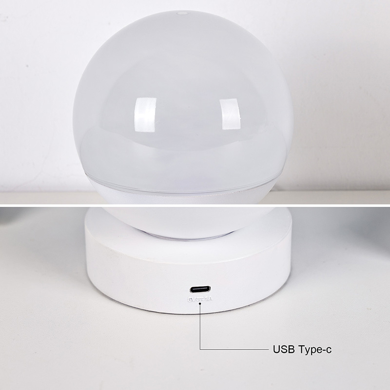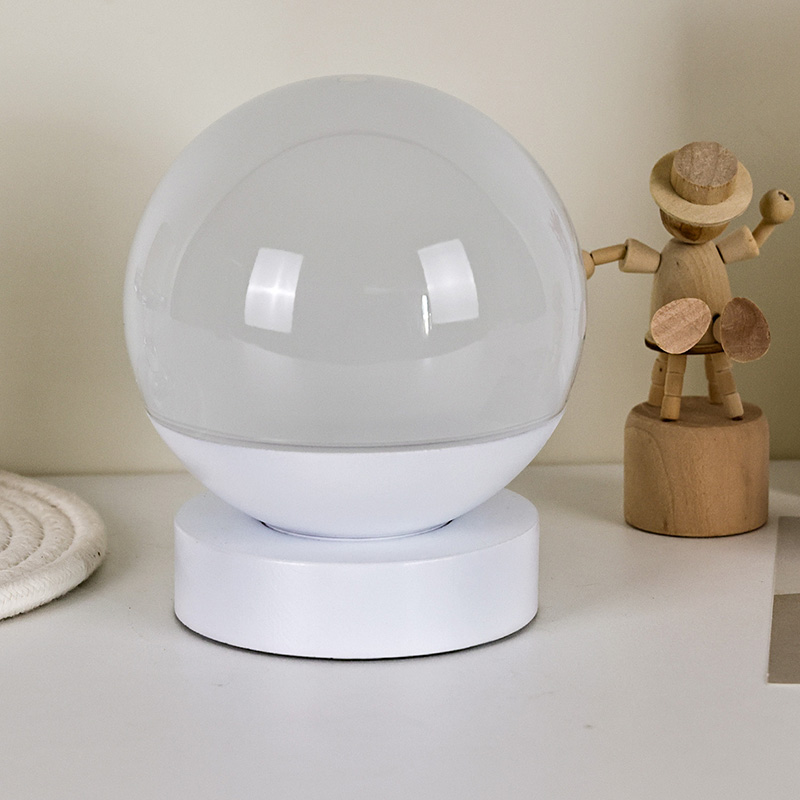 전체적인 디자인은 둥근 구 모양이며, 상반부는 부드럽고 은은한 빛을 발산하는 반투명 반투명 소재로 제작되었습니다. 하반부는 화이트 베이스로 안정적인 지지력을 제공하며 깔끔하고 부드러운 라인이 특징입니다. 컴팩트한 사이즈
