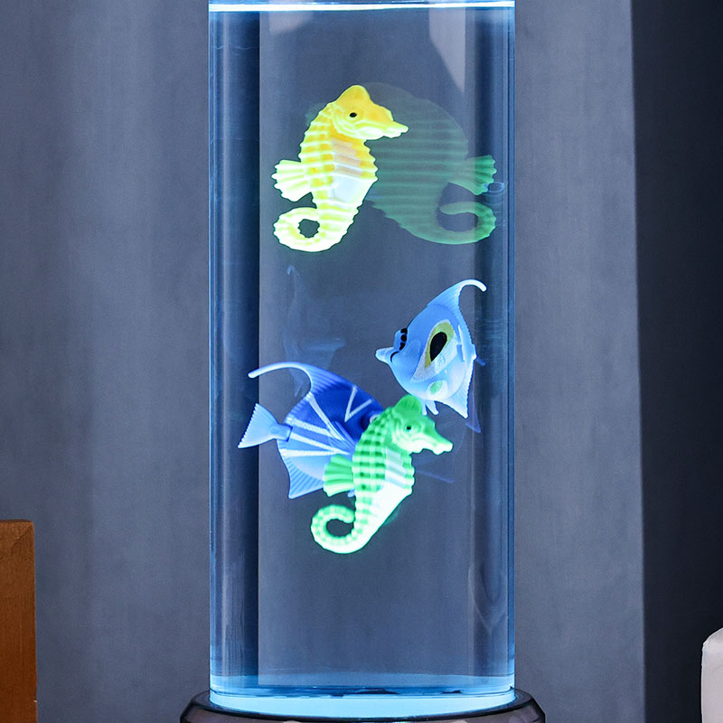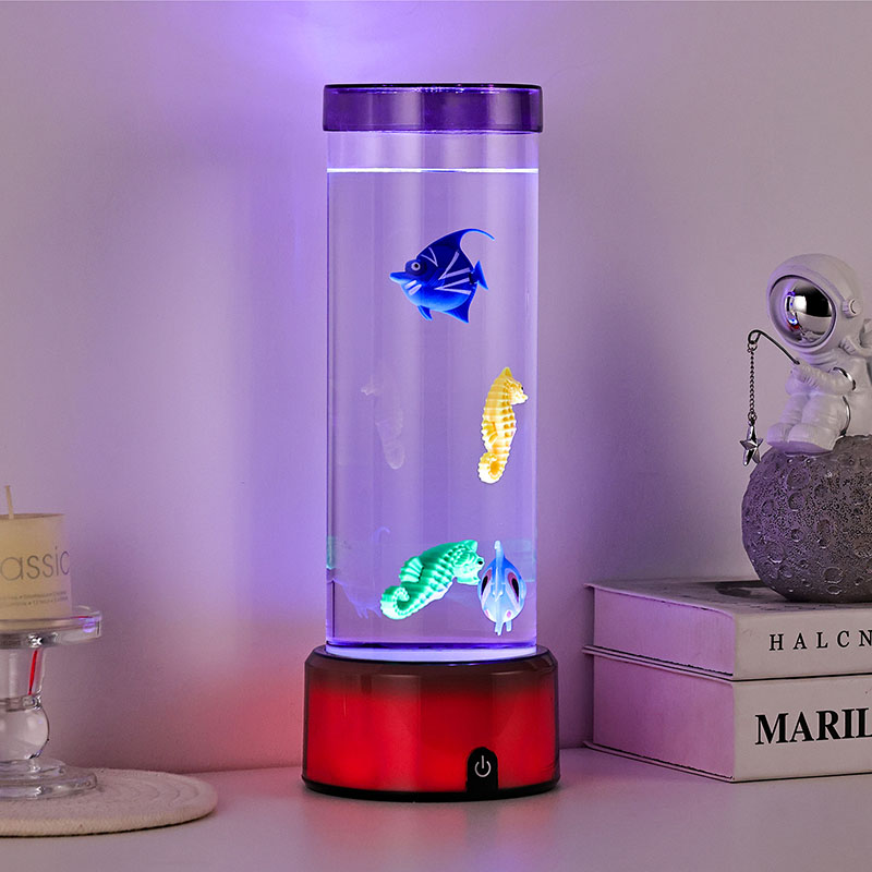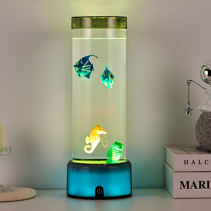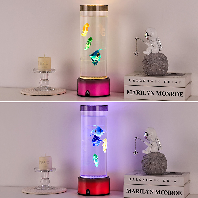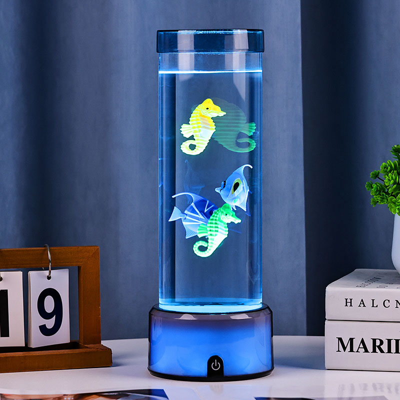 매력. 고품질의 내구성이 뛰어난 플라스틱으로 제작된 이 매혹적인 램프는 투명한 액체로 채워진 날렵한 원통형 본체와 생기 넘치는 열대어와 매력적인 해마를 포함하여 아름답게 세밀하게 묘사된 떠다니는 물고기 형상을 갖추고 있어 모든 공간에 평온함과 시각적 즐거움을 선사하는 고요하고 생생한 바다 장면을 연출합니다.
