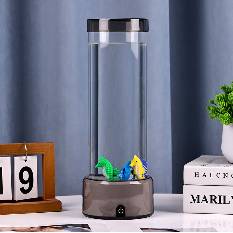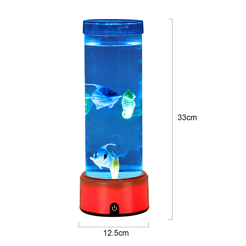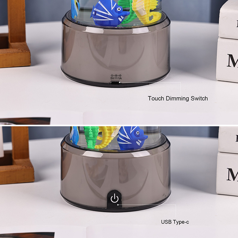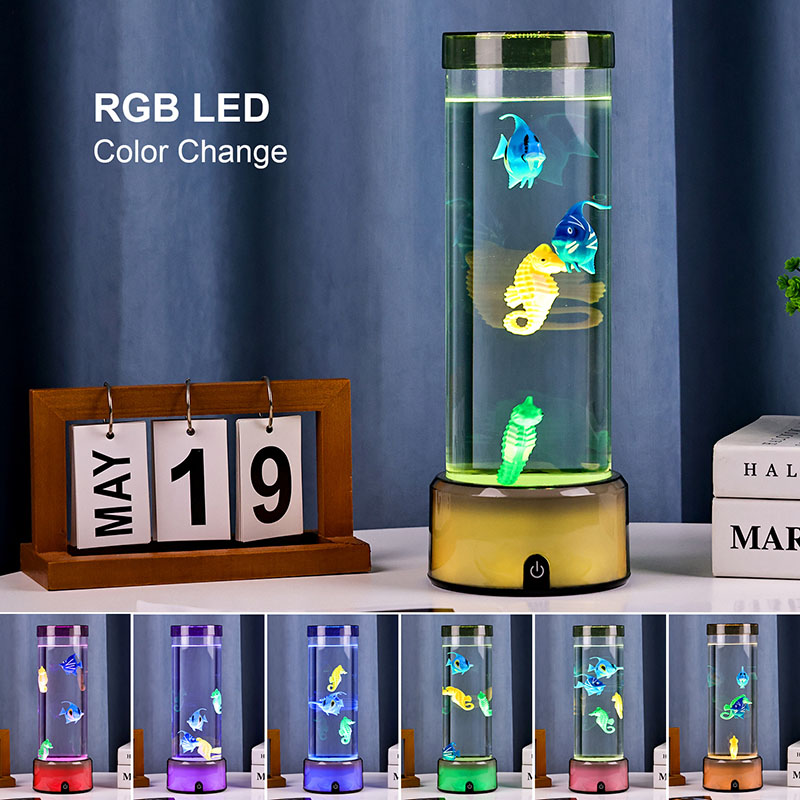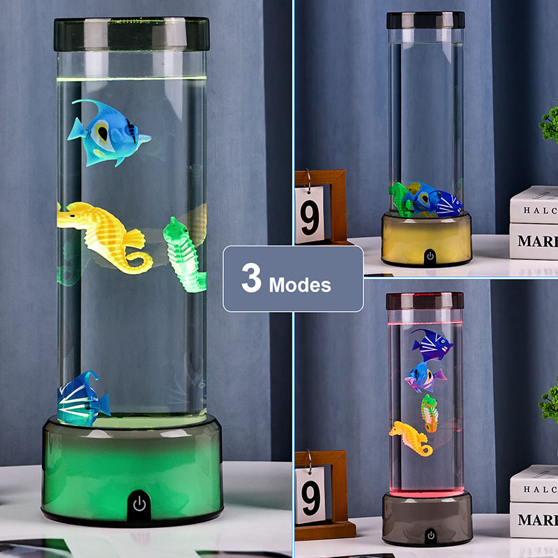 매력. 고품질의 내구성이 뛰어난 플라스틱으로 제작된 이 매혹적인 램프는 투명한 액체로 채워진 날렵한 원통형 본체와 생기 넘치는 열대어와 매력적인 해마를 포함하여 아름답게 세밀하게 묘사된 떠다니는 물고기 형상을 갖추고 있어 모든 공간에 평온함과 시각적 즐거움을 선사하는 고요하고 생생한 바다 장면을 연출합니다.