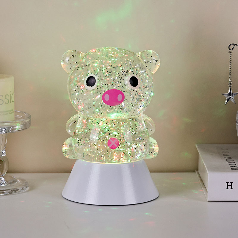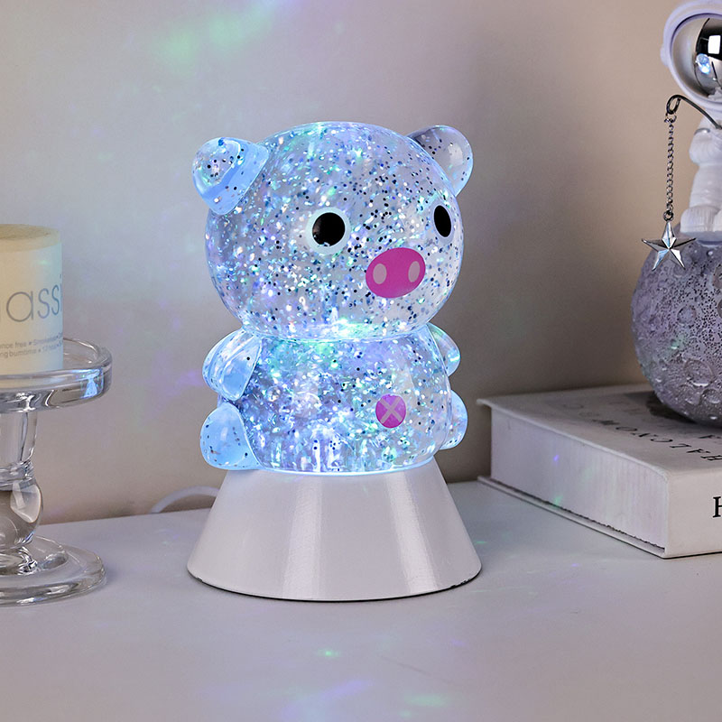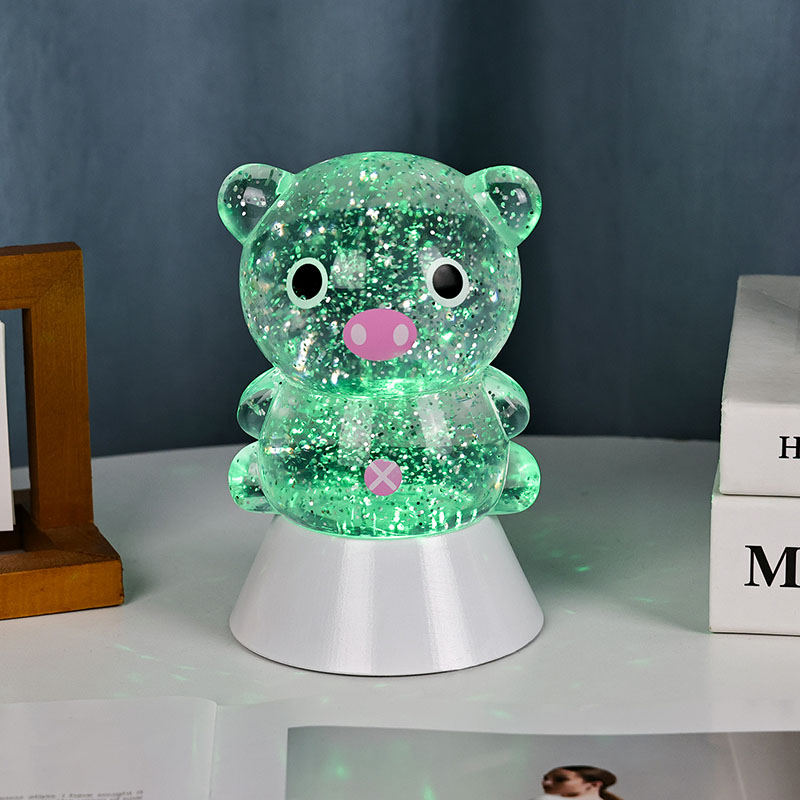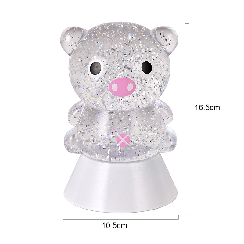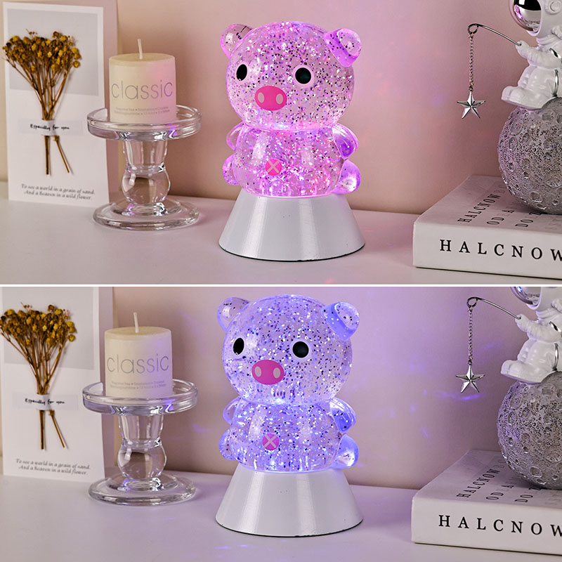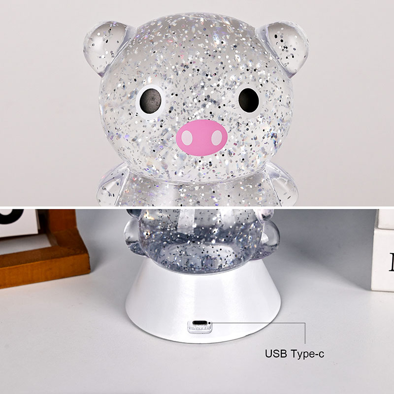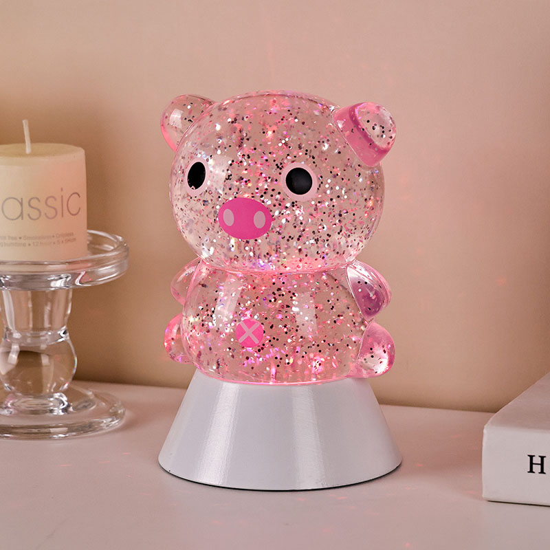 전체적인 디자인은 귀엽고 사랑스러운 돼지 이미지가 특징이며, 둥글고 통통한 윤곽과 큰 눈, 분홍빛 주둥이, 사랑스러운 작은 귀가 어우러져 어른과 아이 모두의 마음을 단숨에 사로잡습니다. 투명한 레진 껍질에 반짝이는 컬러의 스팽글과 특수 액체가 채워져 있으며, 조명이 켜지면 액체와 함께 부드럽게 흘러 돼지 몸 안에 별이 빛나는 강이 흐르는 듯한 몽환적인 시각적 효과를 연출합니다. 연한 핑크색, 몽환적인 보라색, 상큼한 파란색, 녹색으로 자동으로 바뀌는 밝은 색상은 무지개색으로 계속 변하면서 평화로우면서도 마법 같은 분위기를 자아냅니다. 마치 동화의 세계를 현실로 옮겨 놓은 것 같습니다.