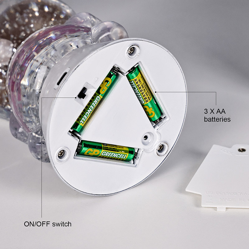 피그쉐이드 RGB 글리터 테이블 램프는 하단에 심플하고 우아한 화이트 베이스 디자인이 적용되어 전체적인 미적 아름다움을 높여줄 뿐만 아니라 넘어짐을 방지하기 위해 안정성을 향상시켰습니다. 베이스에는 사용자가 AAA 배터리 3개(포함되지 않음)를 쉽게 설치할 수 있는 내부 배터리 칸이 포함되어 있습니다. 플러그를 꽂을 필요가 없어 휴대성이 뛰어나며 침대, 책상, 유아용 침대 옆에 두거나 여행 중에 배치하는 데 이상적입니다. 스위치 디자인은 사용자 친화적으로 설계되어 간단한 터치만으로 쉽게 켜고 끌 수 있으며, 안전하고 간단하게 작동할 수 있으며, 특히 어린이가 독립적으로 사용하기에 적합합니다.